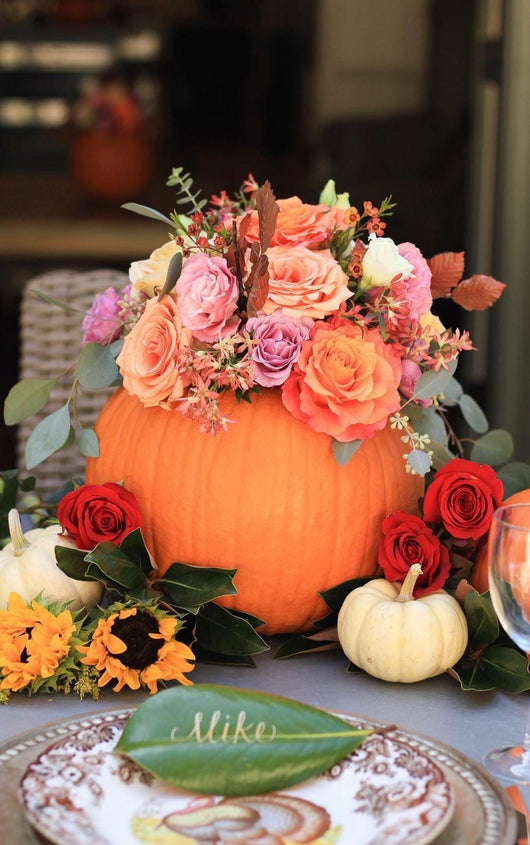 All pumpkins are medium sized (about the size of a large melon), and are bursting with a beautiful array of season flowers including roses, ranunculus, lisianthus, carnations, seasonal greens and more. If you have a specific color palette, please mention this in the Notes at Checkout.